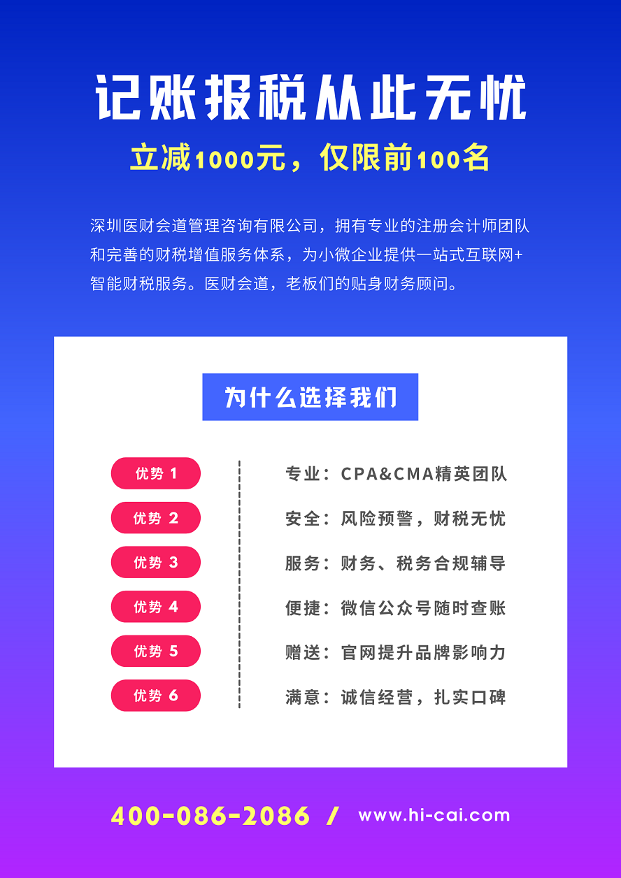 小規模納稅人代理記賬服務。基礎套餐:1998元/年,僅含記賬報稅服務;增值套餐:6000元/年,包含記賬報稅、風險預警、合規籌劃、手機查賬、贈送官網等服務。限時年中鉅惠,掃碼立減1000元,僅限前100名,先到先得。